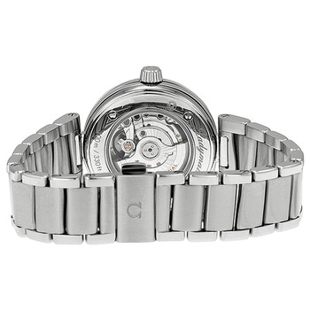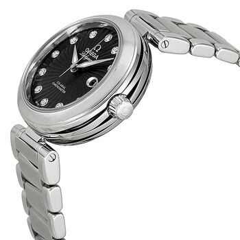 Stainless steel case with a stainless steel bracelet. Fixed stainless steel bezel. Black textured dial with luminous silver-tone hands and diamond hour markers. Dial Type: Analog. Luminescent hands. Date display at the 3 o'clock position. Omega calibre 8520 automatic movement with a 50-hour power reserve. Scratch resistant sapphire crystal. Screw down crown. Skeleton case back. Round case shape. Case size: 34 mm. Deployment clasp with a push button release. Water resistant at 100 meters / 330 feet. Functions: date, hour, minute, second, chronometer. Luxury watch style. Watch label: Swiss Made. Item Variations: 425 30 34 20 51 001, 425-30-34-20-51-001, 425/30/34/20/51/001, 42530342051001. Omega DeVille Ladymatic Diamond Automatic Black Dial Ladies Watch 425.30.34.20.51.001.