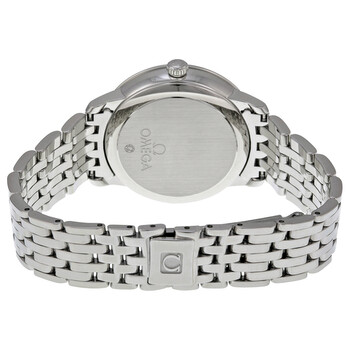 Stainless steel case with a stainless steel bracelet. Fixed stainless steel bezel. Mother of pearl dial with silver-tone dauphine-style shape hands and index hour markers. Roman numerals mark the 6, 9 and 12 o'clock positions. Dial Type: Analog. Date display at the 3 o'clock position. Omega calibre 2500 automatic movement, based upon ETA 2892-A2, containing 27 Jewels, bitting at 25200 vph, and has a power reserve of approximately 48 hours. Scratch resistant sapphire crystal. Pull / push crown. Solid case back. Round case shape. Case size: 32.7 mm. Case thickness: 9.5 mm. Band width: 16 mm. Fold over clasp. Water resistant at 30 meters / 100 feet. Functions: date, hour, minute, second, co-axial escapement, chronometer. Luxury watch style. Watch label: Swiss Made. Omega DeVille Prestige Automatic Ladies Watch 42410332005001.