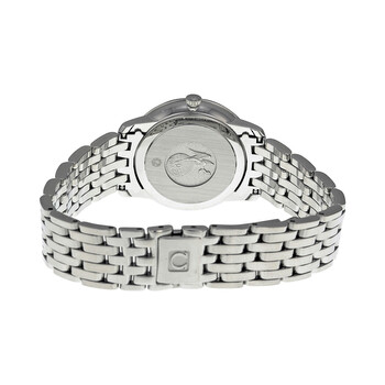 Stainless steel case with a stainless steel bracelet. Fixed stainless steel bezel. Blue dial with silver-toned hands and diamond hour markers. Roman numerals mark the 3, 6, 9 and 12 o'clock positions. Dial Type: Analog. Quartz movement. Scratch resistant sapphire crystal. Solid case back. Case diameter: 27.4 mm. Cae thickness: 7 mm. Round case shape. Bracelet width: 14 mm. Deployment clasp. Water resistant at 30 meters / 100 feet. Functions: hour, minute. Luxury watch style. Watch label: Swiss Made. Omega DeVille Prestige Blue Diamond Dial Stainless Steel Ladies Watch 42410276053001.