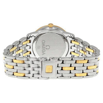 Stainless steel case with a stainless steel bracelet with 18kt yellow gold links. Fixed 18kt yellow gold bezel. Champagne dial with yellow gold hands and index hour markers. Roman numerals mark the 3, 6, 9 and 12 o'clock positions. Dial Type: Analog. Omega calibre 1376 quartz movement with a 48 months power reserve. Scratch resistant sapphire crystal. Pull / push crown. Solid case back. Round case shape. Case size: 27.4 mm. Band width: 14 mm. Fold over clasp with a push button release. Water resistant at 30 meters / 100 feet. Functions: hour, minute. De Ville Prestige Series. Luxury watch style. Watch label: Swiss Made. Item Variations: 424 20 27 60 08 001, 424-20-27-60-08-001, 424/20/27/60/08/001, 42420276008001. Omega DeVille Prestige Champagne Dial Steel and Yellow Gold Ladies Watch 42420276008001.