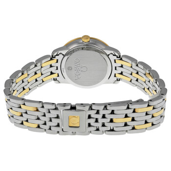 Stainless steel case with a stainless steel bracelet with 18kt yellow gold links. Fixed 18kt yellow gold bezel. Mother of pearl with diamonds dial with yellow gold-tone hands and diamond hour markers. Roman numeralsappear at the 3, 6, 9 and 12 o'clock positions. Dial Type: Analog. Omega calibre 1376 quartz movement with a 48 months power reserve. Scratch resistant sapphire crystal. Pull / push crown. Solid case back. Round case shape. Case size: 24.4 mm. Band width: 12 mm. Fold over clasp with a push button release. Water resistant at 30 meters / 100 feet. Functions: hour, minute. Luxury watch style. Watch label: Swiss Made. Omega DeVille Prestige Mother of Pearl Diamond Dial Ladies Watch 42420246055001.