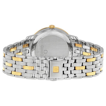 Stainless steel case with a stainless steel bracelet with 18kt yellow gold links. Fixed 18kt yellow gold bezel. Champagne dial with yellow gold-tone dauphine-style hands and index hour markers. Roman numerals mark the 3, 6, 9 and 12 o'clock positions. Dial Type: Analog. Date display at the 3 o'clock position. Omega calibre 2500 automatic movement, based upon ETA 2892-A2, containing 27 Jewels, bitting at 25200 vph, and has a power reserve of approximately 48 hours. Scratch resistant sapphire crystal. Pull / push crown. Solid case back. Round case shape. Case size: 36.8 mm. Case thickness: 7 mm. Band width: 20.3 mm. Band length: 8 inches. Fold over clasp with a push button release. Water resistant at 30 meters / 100 feet. Functions: date, hour, minute, second, co-axial escapement, chronometer. De Ville Prestige Co-axial Series. Luxury watch style. Watch label: Swiss Made. Omega DeVille Prestige Steel 18kt Yellow Gold Champagne Dial Unisex Watch 42420372008001.