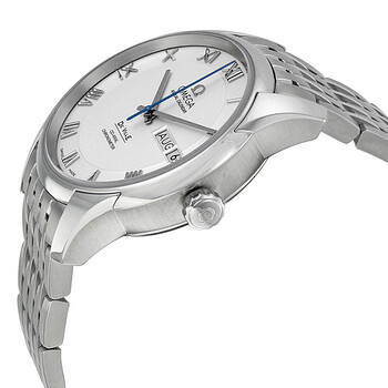 Stainless steel case with a stainless steel bracelet. Fixed stainless steel bezel. Silver dial with silver-toned hands and Roman numeral hour markers. Dial Type: Analog. Day of the week and date display at the 3 o'clock position. Automatic movement with 55 hour power reserve. Scratch resistant sapphire crystal. Pull / push crown. Skeleton case back. Case diameter: 41 mm. Round case shape. Band width: 22.9 mm. Band length: 9 inches. Fold over clasp with push button release. Water resistant at 100 meters / 330 feet. Functions: date, day, hour, minute, second. Luxury watch style. Watch label: Swiss Made. Omega Deville Silver Dial Stainless Steel Men's Watch 43110412202001.