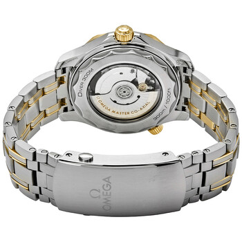 Stainless steel case with a stainless steel bracelet with 18kt yellow gold links. Uni-directional rotating 18kt yellow gold bezel with a black ceramic ring. Black dial with yellow gold skeleton hands and dot hour markers. Minute markers around the outer rim. Dial Type: Analog. Luminescent hands and markers. Date display 6 o'clock position. Omega calibre 8800 automatic movement, containing 35 Jewels, bitting at 25200 vph, and has a power reserve of approximately 55 hours. Scratch resistant sapphire crystal. Screw down crown. Transparent case back. Round case shape. Case size: 42 mm. Band width: 20 mm. Deployment clasp with a push button release. Water resistant at 300 meters / 1000 feet. Functions: date, hour, minute, second, chronometer. Diver 300m Series. Dive watch style. Watch label: Swiss Made. Omega Diver 300M Automatic Chronometer Black Dial Men's Watch 210.20.42.20.01.002.