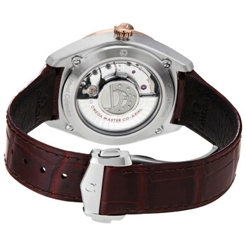 Silver-tone stainless steel case with a burgundy leather (alligator) strap. Fixed 18kt rose gold bezel. Burgundy (pie pan) dial with rose gold hands and index hour markers. Months display. Minute markers around the outer rim. Dial Type: Analog. Luminescent hands and markers. Date display at the 6 o'clock position. Omega Calibre 8922 Automatic movement, containing 39 Jewels, bitting at 25200 vph, and has a power reserve of approximately 55 hours. Scratch resistant sapphire crystal. Transparent case back. Round case shape, case size: 41 mm. Band width: 20 mm. Tang clasp. Water resistant at 100 meters / 330 feet. Functions: annual calendar, month, date, hour, minute, second, co-axial escapement, chronometer. Globemaster Series. Luxury watch style. Watch label: Swiss Made. Omega Globemaster Annual Calendar Automatic Chronometer Burgundy Dial Men's Watch 130.23.41.22.11.001.
