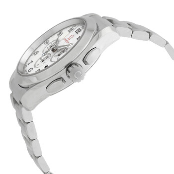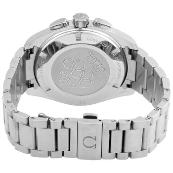 Silver-tone stainless steel case and bracelet. Fixed silver-tone stainless steel bezel. Silver dial with silver-tone hands and Arabic numeral hour markers. Arabic numeral minute markers (at 5 minute intervals). Dial Type: Analog. Date display between 4 and 5 o'clock position. Chronograph - three sub-dials displaying: 12 hour, 60 second and 30 minute. Omega Calibre 3313 Automatic movement, based upon Piguet 1285, containing 37 Jewels, bitting at 28800 vph, and has a power reserve of approximately 52 hours. Scratch resistant sapphire crystal. Round case shape, case size: 44 mm. Band width: 21 mm. Fold over clasp with a safety release. Water resistant at 150 meters / 500 feet. Functions: chronograph, date, hour, minute, second, co-axial escapement, chronometer. Olympic Games Collection Series. Luxury watch style. Watch label: Swiss Made. Omega Olympic Games Collection Chronograph Automatic Chronometer Silver Dial Men's Watch 231.10.44.50.02.001.