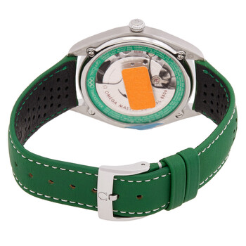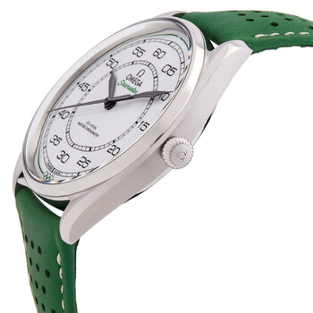 Silver-tone stainless steel case with a green leather strap. Fixed silver-tone stainless steel bezel. White dial with black hands and Arabic numeral hour markers. Dial Type: Analog. Omega Calibre 8806 Automatic movement, containing 35 Jewels, bitting at 25200 vph, and has a power reserve of approximately 55 hours. Scratch resistant sapphire crystal. Transparent case back. Round case shape, case size: 39.5 mm. Band width: 20 mm. Buckle clasp. Water resistant at 60 meters / 200 feet. Functions: hour, minute, second, co-axial escapement, chronometer, magnetic resistant. Olympic Official Timekeeper Series. Luxury watch style. Watch label: Swiss Made. Omega Olympic Official Timekeeper Automatic Chronometer White Dial Men's Limited Edition Watch 522.32.40.20.04.005.