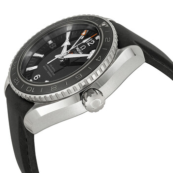 Stainless steel case with a black rubber strap. Bi-directional rotating stainless steel bezel with black ceramic top ring showing 24 hour markings. Black dial with luminous silver-toned hands and index hour markers. Arabic numerals mark the 6, 9 and 12 o'clock positions. minute markers around the outer rim. Dial Type: Analog. Luminescent hands and markers. Date display at the 6 o'clock position. Omega calibre 8605 automatic movement with a 60-hour power reserve. Scratch resistant sapphire crystal. Screw down crown. Transparent case back. Round case shape. Case size: 43.5 mm. Case thickness: 17.25 mm. Band width: 22.9 mm. Band length: 7 inches. Fold over clasp with a push button release. Water resistant at 600 meters / 2000 feet. Functions: GMT, second time zone, date, hour, minute, second, chronometer. Luxury watch style. Watch label: Swiss Made. Item Variations: 232 32 44 22 01 001, 232-32-44-22-01-001, 232/32/44/22/01/001, 23232442201001. Omega Planet Ocean Automatic Black Dial Men's Watch 232.32.44.22.01.001.