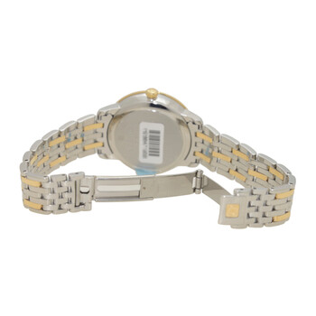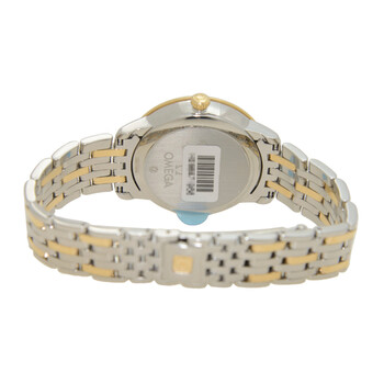 Stainless steel case with a two-tone (gold-tone and solver-tone) stainless steel and 18k yellow gold bracelet. 18k yellow gold and diamond set bezel. Champagne dial with gold-tone hands and Roman numeral and diamond hour markers. Dial Type: Analog. Date display at the 3 o'clock position. Omega Calibre 2500 automatic movement with a 48-hour power reserve. Scratch resistant sapphire crystal. Case size: 32.7 mm. Round case shape. Band width: 16 mm. Water resistant at 30 meters / 100 feet. Functions: date, hour, minute, second, co-axial escapement, chronometer. Luxury watch style. Watch label: Swiss Made. Omega Prestige Automatic Ladies Watch 42425332058001.