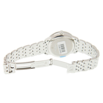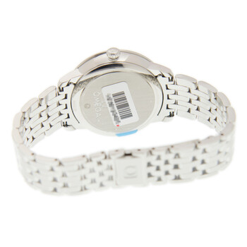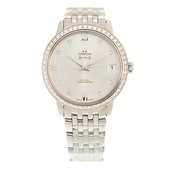 Stainless steel case with a silver-tone stainless steel bracelet. Fixed diamond set bezel. Silver dial with silver-tone hands and Roman numeral and diamond hour markers. Dial Type: Analog. Date display at the 3 o'clock position. Omega Calibre 2500 automatic movement with a 48-hour power reserve. Scratch resistant sapphire crystal. Case size: 32.7 mm. Case thickness: 9.5 mm. Round case shape. Band width: 16 mm. Water resistant at 100 meters / 330 feet. Functions: date, hour, minute, second, co-axial escapement, chronometer. Luxury watch style. Watch label: Swiss Made. Omega Prestige Automatic Ladies Watch 424.15.33.20.52.001.