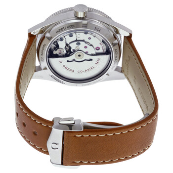 Stainless steel case with a brown leather strap. Uni-directional rotating coin edge stainless steel bezel with a black ceramic (count-up elapsed time) top ring. Black dial with luminous silver-tone arrow-shaped hands and index hour markers. Arabic numerals mark the 3, 6, 9 amd 12 o'clock positions. Minute markers around the outer rim. Dial Type: Analog. Luminescent hands and markers. Omega calibre 8400 automatic movement, based upon Omega 8500, containing 39 Jewels, bitting at 25200 vph, and has a power reserve of approximately 60 hours. Scratch resistant sapphire crystal. Screw down crown. Transparent case back. Round case shape. Case size: 41 mm. Case thickness: 14 mm. Band width: 21 mm. Fold over with push button release clasp. Water resistant at 300 meters / 1000 feet. Functions: hour, minute, second, co-axial escapement, chronometer. Seamaster 300 Series. Luxury watch style. Watch label: Swiss Made. Omega Seamaster 300 Automatic Black Dial Men's Watch 233.32.41.21.01.002.
