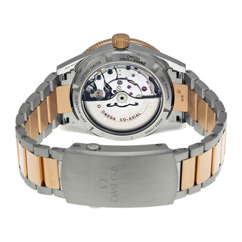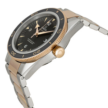 Silver-tone stainless steel case with a two-tone (silver-tone and rose gold-tone) stainless steel and 18kt rose gold bracelet. Uni-directional rotating coin edge 18kt rose gold bezel with a black ceramic count-up elapsed time top ring. Black dial with luminous rose gold-tone arrow-shaped hands and index hour markers. Arabic numerals appear at the 3, 6, 9 and 12 o'clock positions. minute markers around the outer rim. Dial Type: Analog. Luminescent hands and markers. Omega Calibre 8400 Automatic movement, based upon Omega 8500, containing 39 Jewels, bitting at 25200 vph, and has a power reserve of approximately 60 hours. Scratch resistant sapphire crystal. Screw down crown. Exhibition case back. Round case shape, case size: 41 mm, case thickness: 11 mm. Band width: 18 mm, band length: 8 inches. Deployment clasp. Water resistant at 300 meters / 1000 feet. Functions: hour, minute, second, co-axial escapement, chronometer. Additional Info: anti-magnetism feature. Seamaster Series. Luxury watch style. Watch label: Swiss Made. Item Variations: 233 20 41 21 01 001, 233-20-41-21-01-001, 233/20/41/21/01/001, 23320412101001. Omega Seamaster 300 Automatic Black Dial Men's Watch 233.20.41.21.01.001.