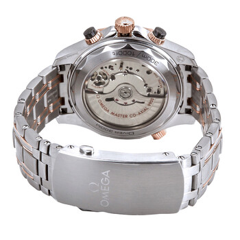 Stainless steel case with a stainless steel bracelet with 18kt sedna gold accents. Uni-directional rotating 18kt sedna gold bezel with a black ceramic (count-up elapsed time) top ring. Black dial with luminous rose gold-tone skeleton hands and dot hour markers. Minute markers around the outer rim. Dial Type: Analog. Luminescent hands and markers. Date display at the 6 o'clock position. Chronograph - two sub-dials displaying: 60 second and 12 hour. Omega calibre 9900 automatic movement, based upon Omega 9300, containing 54 Jewels, bitting at 28800 vph, and has a power reserve of approximately 60 hours. Scratch resistant sapphire crystal. Screw down crown. Transparent s case back. Round case shape. Case size: 44 mm. Band width: 21 mm. Fold over clasp with a push button release. Water resistant at 300 meters / 1000 feet. Functions: chronograph, date, hour, minute, second,chronometer. Seamaster 300 Master Co-axial Series. Dive watch style. Watch label: Swiss Made. Omega Seamaster 300 Master Co-Axial Chronograph Automatic Chronometer Black Dial Men's Watch 210.20.44.51.01.001.