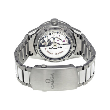 Titanium case with a titanium bracelet. Uni-directional rotating titanium bezel with a blue ceramic top ring. Blue dial with luminous silver-tone hands and index hour markers. Arabic numerals mark the 3, 6, 9 and 12 o'clock positions. Minute markers around the outer rim. Dial Type: Analog. Luminescent hands and markers. Automatic movement with a 60-hour power reserve. Scratch resistant sapphire crystal. Screw down crown. Transparent case back. Case diameter: 41 mm. Case thickness: 18 mm. Round case shape. Bracelet width: 21 mm Fold over clasp with a push button release. Water resistant at 300 meters / 1000 feet. Functions: hour, minute, second. Dress watch style. Omega Seamaster 300 Master Co-Axial Blue Dial Titanium Men's Watch 23390412103001.