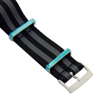 Silver-tone stainless steel case with a black and grey stripe nylon bracelet. Bi-directional rotating black ceramic bezel. Black dial with luminous silver-tone hands and index hour markers. Arabic numerals mark the 3, 6, and 9 o'clock positions. minute markers around the outer rim. Dial Type: Analog. Luminescent hands and markers. Omega Calibre 8400 automatic movement with a 60-hour power reserve. Scratch resistant sapphire crystal. Screw down crown. Transparent case back. Case size: 41 mm. Round case shape. Band width: 24 mm. Band length: 9 inches. Tang clasp. Water resistant at 300 meters / 1000 feet. Functions: hour, minute, second, co-axial escapement, chronometer. Additional Info: limited to 7,007 models. Luxury watch style. Watch label: Swiss Made. Item Variations: 23332412101001. Omega Seamaster 300 Spectre Limited Edition Automatic Men's Watch 233.32.41.21.01.001.