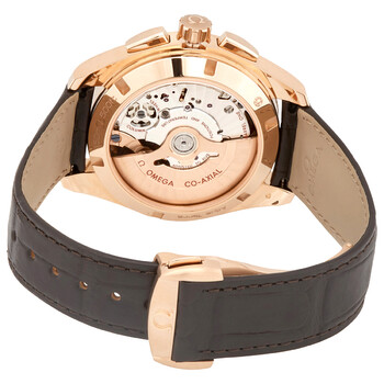 18kt rose gold case with a brown leather strap. Fixed 18kt rose gold bezel. Silver dial with gold-tone arrow-shaped hands and index hour markers. Minute markers around the outer rim. Dial Type: Analog. Luminescent hands and markers. Date display at the 6 o'clock position. Chronograph - two sub-dials displaying: 24 hour / 60 second and 12 hour / 60 minute. Omega Calibre 9615 Automatic movement, containing 54 Jewels, bitting at 28800 vph, and has a power reserve of approximately 60 hours. Scratch resistant sapphire crystal. Screw down crown. Transparent case back. Round case shape. Case size: 43 mm. Band width: 21 mm. Deployment buckle clasp. Water resistant at 150 meters / 500 feet. Functions: chronograph, column wheel, date, GMT, second time zone, hour, minute, second, co-axial escapement, chronometer. Luxury watch style. Watch label: Swiss Made. Omega Seamaster Aqua Terra 18kt Rose Gold Automatic Chronograph GMT Men's Watch 231.53.43.52.02.001.