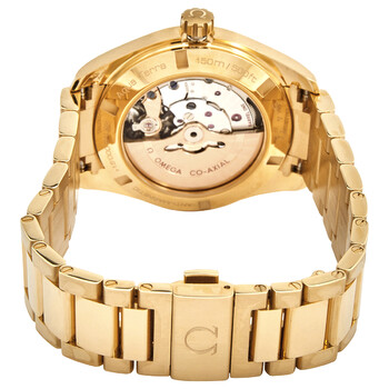 18kt yellow gold case with a 18kt yellow gold bracelet. Fixed 18kt yellow gold bezel. Champagne dial with gold-tone arrow-shaped hands and index hour markers. Minute markers around the inner rim. Dial Type: Analog. Luminescent hands and markers. Date display at the 3 o'clock position. Omega Calibre 8501 Automatic movement, based upon Omega 8500, containing 39 Jewels, bitting at 25200 vph, and has a power reserve of approximately 60 hours. Scratch resistant sapphire crystal. Screw down crown. Transparent case back. Round case shape. Case size: 41.5 mm. Band width: 20 mm. Deployment clasp. Water resistant at 150 meters / 500 feet. Functions: date, hour, minute, second, co-axial escapement, chronometer, magnetic resistant. Luxury watch style. Watch label: Swiss Made. Omega Seamaster Aqua Terra 18kt Yellow Gold Automatic Men's Watch 231.50.42.21.08.001.