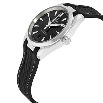 Stainless steel case with a black rubber strap. Fixed smooth stainless steel bezel. Black dial with luminous silver-tone arrow-shaped hands and index hour markers. Arabic numeral minute markers (at 5 minute intervals). Minute markers around the outer rim. Dial Type: Analog. Luminescent hands and markers. Date display at the 6 o'clock position. Omega calibre 8800 automatic movement, containing 35 Jewels, bitting at 25200 vph, and has a power reserve of approximately 55 hours. Scratch resistant sapphire crystal. Screw down crown. Transparent case back. Round case shape. Case size: 38 mm. Case thickness: 13.2 mm. Band width: 19 mm. Deployment clasp. Water resistant at 150 metres / 500 feet. Functions: date, hour, minute, second. Seamaster Aqua Terra Series. Luxury watch style. Watch label: Swiss Made. Omega Seamaster Aqua Terra Automatic Black Dial Men's Watch 220.12.38.20.01.001.