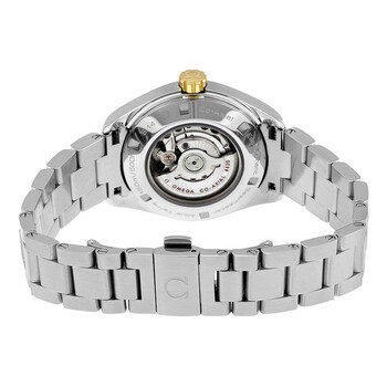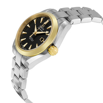 Stainless steel case with a stainless steel bracelet. Fixed 18kt yellow gold bezel. Black dial with yellow gold hands and index hour markers. Minute markers around the outer rim. Dial Type: Analog. Luminescent hands and markers. Date display at the 3 o'clock position. Automatic movement with a 50 hour power reserve. Scratch resistant sapphire crystal. Screw down crown. Transparent case back. Case diameter: 34 mm. Case thickness: 13 mm. Round case shape. Band width: 16 mm. Deployment clasp. Water resistant at 30 meters / 100 feet. Functions: date, hour, minute, second. Luxury watch style. Watch label: Swiss Made. Item Variations: 231 20 34 20 01 004, 231-20-34-20-01-004, 231/20/34/20/01/004, 23120342001004. Omega Seamaster Aqua Terra Automatic Black Dial Stainless Steel Ladies Watch 231.20.34.20.01.004.