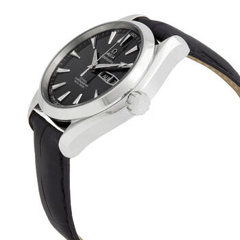 Stainless steel case with a black (alligator) leather strap. Fixed stainless steel bezel. Black dial with silver-tone arrow-shaped hands and index hour markers. Minute markers around the outer rim. Dial Type: Analog. Luminescent hands and markers. Month and date display at the 3 o'clock position. Omega calibre 8605 automatic movement, based upon Omega 8500, containing 38 Jewels, bitting at 25200 vph, and has a power reserve of approximately 60 hours. Scratch resistant sapphire crystal. Screw down crown. Transparent case back. Round case shape. Case size: 43 mm. Band width: 21 mm. Deployment clasp. Water resistant at 150 meters / 500 feet. Functions: date, GMT, second time zone, hour, minute, second, co-axial escapement, chronometer. Luxury watch style. Watch label: Swiss Made. Item Variations: 231 13 43 22 06 001, 231-13-43-22-06-001, 231/13/43/22/06/001, 23113432206001. Omega Seamaster Aqua Terra Automatic Chronometer Black Dial Men's Watch 231.13.43.22.06.001.