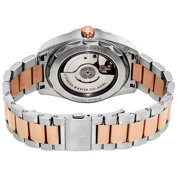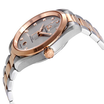 Silver-tone stainless steel case with a two-tone (silver-tone and rose gold-tone) stainless steel with 18kt sedna gold bracelet. Fixed smooth rose gold-tone 18kt sedna gold bezel. Grey dial with luminous 18kt sedna gold arrow-shaped hands and diamond hour markers. Dial Type: Analog. Luminescent hands. Date display at the 6 o'clock position. Omega Calibre 8800 Automatic movement, containing 35 Jewels, bitting at 25200 vph, and has a power reserve of approximately 55 hours. Scratch resistant sapphire crystal. Screw down crown. Transparent see through case back. Round case shape, case size: 38 mm. Band width: 19 mm. Fold over with push button release clasp. Water resistant at 150 meters / 500 feet. Functions: date, hour, minute, second, co-axial escapement, chronometer. Seamaster Aqua Terra Series. Luxury watch style. Watch label: Swiss Made. Omega Seamaster Aqua Terra Automatic Chronometer Diamond Grey Dial Watch 220.20.38.20.56.002.