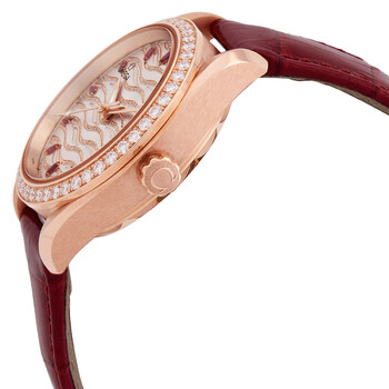 18k sedna gold case with a red leather strap. Fixed 18k sedna gold bezel set with diamonds. White dial with rose gold-tone hands and index marquise-cut rubies hour markers. Dial Type: Analog. Luminescent hands. Automatic movement. Scratch resistant sapphire crystal. Transparent see through case back. Round case shape, case size: 34 mm. Band width: 16 mm. Water resistant at 150 meters / 500 feet. Functions: hour, minute, second, anti-magnetic, chronometer. Additional Info: The radiant dial features a wave pattern made from 138 diamonds. Seamaster Aqua Terra Series. Luxury watch style. Watch label: Swiss Made. Omega Seamaster Aqua Terra Automatic Chronometer Diamond White Dial Ladies Watch 220.58.34.20.99.004.