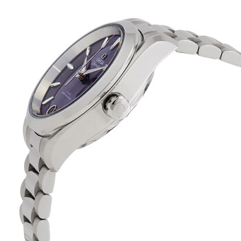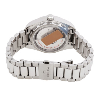Silver-tone stainless steel case and bracelet. Fixed silver-tone stainless steel bezel. Lavender dial with 18k white gold hands and index hour markers. Dial Type: Analog. Date display at the 6 o'clock position. Omega Calibre 8800 Automatic movement, containing 35 Jewels, bitting at 25200 vph, and has a power reserve of approximately 55 hours. Scratch resistant sapphire crystal. Pull / push crown. Transparent see through case back. Round case shape, case size: 34 mm. Band width: 16 mm. Fold over clasp. Water resistant at 150 meters / 500 feet. Functions: date, hour, minute, second, co-axial escapement, chronometer, magnetic resistant. Seamaster Aqua Terra Series. Luxury watch style. Watch label: Swiss Made. Omega Seamaster Aqua Terra Automatic Chronometer Ladies Watch 220.10.34.20.10.002.