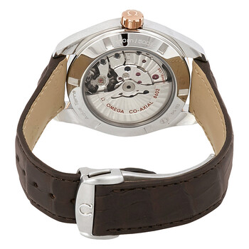 Silver-tone stainless steel case with a brown alligator leather strap. Fixed 18kt rose gold bezel. Teak grey dial with luminous rose gold-tone arrow-shape hands and index hour markers. Arabic numeral minute markers (at 5 minute intervals). minute markers around the outer rim. Dial Type: Analog. Luminescent hands and markers. Date display at the 6 o'clock position. day of the week display centered on the 12 o'clock position. Omega Calibre 8602 automatic movement with a 55-hour power reserve. Scratch resistant sapphire crystal. Screw down crown. Transparent case back. Round case shape. Case size: 41.5 mm. Band width: 20 mm. Tang clasp. Water resistant at 150 meters / 500 feet. Functions: date, day, hour, minute, second, chronometer. Luxury watch style. Watch label: Swiss Made. Omega Seamaster Aqua Terra Automatic Chronometer Men's Watch 231.23.42.22.06.001.