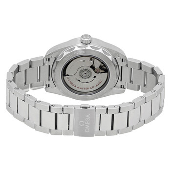 Stainless steel case with a stainless steel bracelet. Fixed smooth stainless steel bezel. Silver dial with luminous black arrow-shaped hands and index hour markers. Minute markers around the outer rim. Dial Type: Analog. Luminescent hands and markers. Date display at the 6 o'clock position. Omega calibre 8800 automatic movement, containing 35 Jewels, bitting at 25200 vph, and has a power reserve of approximately 55 hours. Scratch resistant sapphire crystal. Screw down crown. Transparent case back. Round case shape. Case size: 38 mm. Case thickness: 12.2 mm. Band width: 19 mm. Fold over clasp with a push button release. Water resistant at 150 metres / 500 feet. Functions: date, hour, minute, second, co-axial escapement, chronometer. Seamaster Aqua Terra Series. Luxury watch style. Watch label: Swiss Made. Omega Seamaster Aqua Terra Automatic Chronometer Watch 220.10.38.20.02.001.