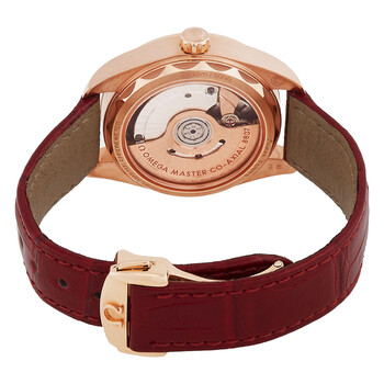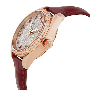 18k sedna gold case with a red alligator leather strap. Fixed 18k sedna gold bezel set with diamonds. White dial set with 498 diamonds. Rose gold-tone hands and index marquise-cut rubies hour markers. Dial Type: Analog. Luminescent hands. Omega Calibre 8807 Automatic movement, based upon Omega 8800, containing 35 Jewels, bitting at 25200 vph, and has a power reserve of approximately 55 hours. Scratch resistant sapphire crystal. Transparent case back. Round case shape, case size: 34 mm, case thickness: 11.9 mm. Band width: 16 mm. Foldover clasp. Water resistant at 150 meters / 500 feet. Functions: hour, minute, second, co-axial escapement, chronometer, magnetic resistant. Seamaster Aqua Terra Series. Luxury watch style. Watch label: Swiss Made. Omega Seamaster Aqua Terra Automatic Diamond Ladies Watch 220.58.34.20.99.001.