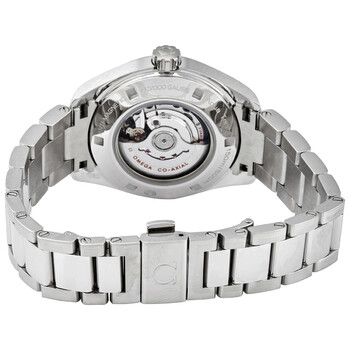 Stainless steel case with a stainless steel bracelet. Fixed stainless steel bezel set with 42 diamonds. Tahiti mother of pearl dial with luminous silver-tone hands and diamond hour markers. Dial Type: Analog. Luminescent hands. Date display above the 6 o'clock position. Omega calibre 8520 automatic movement, based upon Omega 8500, containing 28 Jewels, bitting at 25200 vph, and has a power reserve of approximately 50 hours. Scratch resistant sapphire crystal. Screw down crown. Transparent case back. Round case shape. Case size: 34 mm. Case thickness: 12.5 mm. Band width: 16 mm. Fold over clasp with a push button release. Water resistant at 150 meters/500 feet. Functions: date, hour, minute, second. Seamaster Aqua Terra Series. Dress watch style. Watch label: Swiss Made. Omega Seamaster Aqua Terra Automatic Diamond Ladies Watch 231.15.34.20.57.001.