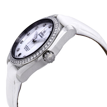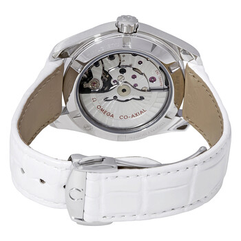 Stainless steel case with a white (alligator) leather strap. Fixed stainless steel set bezel with diamonds. White mother of pearl dial with luminous silver-tone arrow-shaped hands and diamond hour markers. Dial Type: Analog. Luminescent hands. Date display at the 6 o'clock position. Omega calibre 8500 automatic movement, containing 39 Jewels, composed of 202 parts, bitting at 25200 vph, and has a power reserve of approximately 60 hours. Scratch resistant sapphire crystal. Screw down crown. Transparent see through case back. Round case shape. Case size: 38.5 mm. Band width: 19 mm. Deployment clasp. Water resistant at 150 meters / 500 feet. Functions: date, hour, minute, second, co-axial escapement, chronometer. Seamaster Aqua Terra Series. Luxury watch style. Watch label: Swiss Made. Omega Seamaster Aqua Terra Automatic Diamond White Mother of Pearl Dial Ladies Watch 231.18.39.21.55.001.