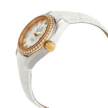 Stainless steel case with a white leather strap. Fixed 18kt yellow gold, diamond set bezel. White mother of pearl dial with gold-tone hands and diamond hour markers. Minute markers around the outer rim. Dial Type: Analog. Luminescent hands. Date display at the 3 o'clock position. Omega Calibre 8520 automatic movement with a 50-hour power reserve. Scratch resistant sapphire crystal. Transparent case back. Case size: 30 mm. Round case shape. Band width: 14 mm. Water resistant at 150 meters / 500 feet. Functions: date, hour, minute, second, co-axial escapement, chronometer. Luxury watch style. Watch label: Swiss Made. Omega Seamaster Aqua Terra Automatic Ladies Watch 231.28.30.20.55.002.