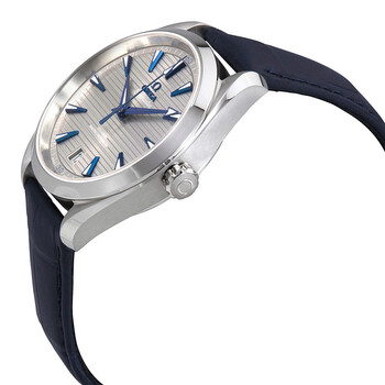 Stainless steel case with a blue (alligator) leather strap. Fixed stainless steel bezel. Grey dial with luminous blue arrow-shaped hands and index hour markers. Arabic numeral minute markers (at 5 minute intervals). Minute markers around the outer rim. Dial Type: Analog. Luminescent hands and markers. Date display at the 6 o'clock position. Omega calibre 8900 automatic movement, based upon Omega 8500, containing 39 Jewels, bitting at 25200 vph, and has a power reserve of approximately 60 hours. Scratch resistant sapphire crystal. Screw down crown. Transparent case back. Round case shape. Case size: 41 mm. Case thickness: 13.2 mm. Band width: 20 mm. Fold over clasp with a push button release. Water resistant at 150 meters / 500 feet. Functions: date, hour, minute, second, co-axial escapement, chronometer. Seamaster Aqua Terra Series. Luxury watch style. Watch label: Swiss Made. Omega Seamaster Aqua Terra Automatic Men's 41 mm Watch 220.13.41.21.06.001.
