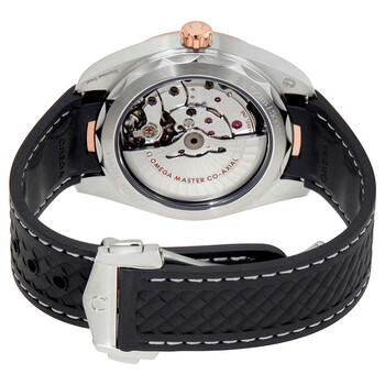 Silver-tone stainless steel case with a black rubber strap. Fixed rose gold-tone 18kt sedna gold bezel. Silver dial with luminous black arrow-shaped hands and index hour markers. Minute markers around the outer rim. Dial Type: Analog. Luminescent hands and markers. Date display at the 6 o'clock position. Omega Calibre 8900 Automatic movement, based upon Omega 8500, containing 39 Jewels, bitting at 25200 vph, and has a power reserve of approximately 60 hours. Scratch resistant sapphire crystal. Screw down crown. Transparent case back. Round case shape, case size: 41 mm, case thickness: 13.2 mm. Band width: 20 mm. Fold over clasp. Water resistant at 150 meters / 500 feet. Functions: date, hour, minute, second. Seamaster Aqua Terra Series. Dress watch style. Watch label: Swiss Made. Omega Seamaster Aqua Terra Automatic Men's 41 mm Watch 220.22.41.21.02.001.