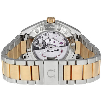 Stainless steel case with a two-tone stainless steel and 18 kt rose gold bracelet. Fixed 18kt rose gold bezel. Grey dial with gold-tone hands and index hour markers. Minute markers around the outer rim. Date display appears at the 3 o'clock position. Automatic movement. Scratch resistant sapphire crystal. Screw down crown. Skeleton case back. Case diameter: 44.5 mm. Case thickness: 13.2 mm. Push button fold over clasp. Water resistant at 150 meters/ 500 feet. Functions: hours, minutes, seconds, calendar. Omega Seamaster Aqua Terra Automatic Men's Watch 23120422106001.