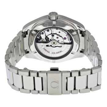 Stainless steel case with a stainless steel bracelet. Fixed stainless steel bezel. Black dial with luminous silver-tone hands and index hour markers. Minute markers around the outer rim. Dial Type: Analog. Luminescent hands and markers. Date display at the 6 o'clock position. Day of the week display centered on the 12 o'clock position. Automatic movement with a 48 hour power reserve. Scratch resistant sapphire crystal. Screw down crown. Skeleton case back. Case diameter: 41.5 mm. Case thickness: 16 mm. Round case shape. Band width: 20.3 mm. Band length: 8 inches. Fold over clasp with a push button release. Water resistant at 150 meters / 500 feet. Functions: date, day, hour, minute, second. Luxury watch style. Watch label: Swiss Made. Omega Seamaster Aqua Terra Black Dial Stainless Steel Automatic Men's Watch 23110422201001.