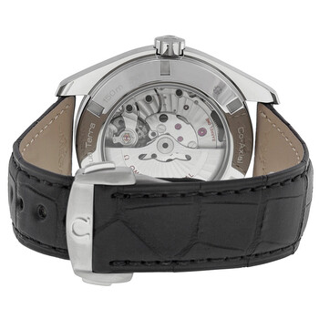Stainless steel case with a black leather strap. Fixed stainless steel bezel. Black dial with luminous hands and index hour markers. 24 hour markers. Minute markers around the outer rim. Dial Type: Analog. Luminescent hands and markers. Date display at the 6 o'clock position. Automatic movement with a 60 hour power reserve. Scratch resistant sapphire crystal. Screw down crown. Skeleton case back. Case diameter: 43 mm. Case thickness: 13 mm. Round case shape. Band width: 24.1 mm. Band length: 9 inches. Deployment clasp. Water resistant at 150 meters / 500 feet. Functions: GMT, second time zone, hour, minute, second. Luxury watch style. Watch label: Swiss Made. Omega Seamaster Aqua Terra Black Dial GMT Automatic Men's Watch 23113432201001.