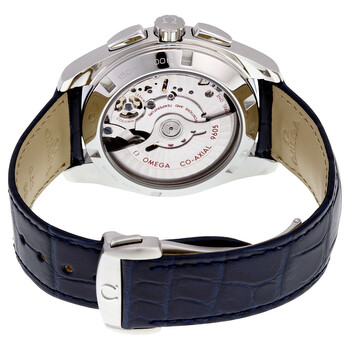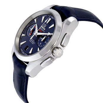 Stainless steel case with a blue (crocodile) leather strap. Fixed stainless steel bezel. Blue dial with luminous silver-tone arrow-shaped hands and index hour markers. Arabic numeral minute markers (at 5 minute intervals). Minute markers around the outer rim. Dial Type: Analog. Luminescent hands and markers. Date display at the 6 o'clock position. Chronograph - two sub-dials displaying: 12 hour and 24 hour (GMT). Omega calibre 9605 automatic movement, based upon Omega 9300, containing 54 Jewels, bitting at 28800 vph, and has a power reserve of approximately 60 hours. Scratch resistant sapphire crystal. Screw down crown. Transparent case back. Round case shape. Case size: 43 mm. Band width: 21.6 mm. Band length: 8.5 inches. Fold over clasp with a safety release. Water resistant at 150 meters / 500 feet. Functions: chronograph, GMT, second time zone, date, hour, minute, second, co-axial escapement, chronometer. Seamaster Aqua Terra Series. Luxury watch style. Watch label: Swiss Made. Item Variations: 231 13 43 52 03 001, 231-13-43-52-03-001, 231/13/43/52/03/001, 23113435203001. Omega Seamaster Aqua Terra Chronograph GMT Automatic Chronometer Blue Dial Men's Watch 231.13.43.52.03.001.