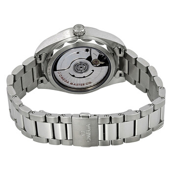 Stainless steel case with a stainless steel bracelet. Fixed smooth stainless steel bezel. Opaline silver dial with luminous sedna gold arrow-shaped hands and index hour markers. Dial Type: Analog. Luminescent hands and markers. Date display at the 6 o'clock position. Omega calibre 8800 automatic movement, containing 35 Jewels, bitting at 25200 vph, and has a power reserve of approximately 55 hours. Scratch resistant sapphire crystal. Screw down crown. Transparent case back. Round case shape. Case size: 34 mm. Band width: 16 mm. Fold over clasp. Water resistant at 150 metres / 500 feet. Functions: date, hour, minute, second. Seamaster Aqua Terra Series. Luxury watch style. Watch label: Swiss Made. Omega Seamaster Aqua Terra Co-Axial Master Chronometer Automatic Ladies Watch 220.10.34.20.02.001.