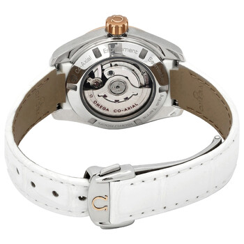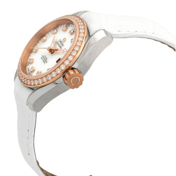 Stainless steel case with a white leather strap. 18kt rose gold and diamond set bezel. White mother of pearl dial with gold-tone hands and diamond hour markers. Minute markers around the outer rim. Dial Type: Analog. Luminescent hands. Date display at the 3 o'clock position. Omega Calibre 8520 automatic movement with a 50-hour power reserve. Scratch resistant sapphire crystal. Transparent case back. Case size: 30 mm. Round case shape. Band width: 14 mm. Water resistant at 150 meters / 500 feet. Functions: date, hour, minute, second, co-axial escapement, chronometer. Luxury watch style. Watch label: Swiss Made. Item Variations: 231 28 30 20 55 001, 231-28-30-20-55-001, 231/28/30/20/55/001, 23128302055001. Omega Seamaster Aqua Terra Diamond Ladies Watch 231.28.30.20.55.001.
