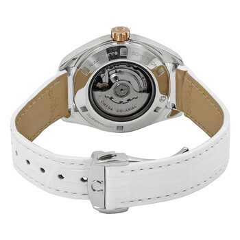 Silver-tone stainless steel case with a white alligator leather strap. Fixed 18kt sedna gold and diamond set bezel. White mother of pearl dial with rose gold-tone arrow-shaped hands and diamond hour markers. Dial Type: Analog. Luminescent hands. Date display at the 6 o'clock position. Omega Calibre 8520 Automatic movement, based upon Omega 8500, containing 28 Jewels, bitting at 25200 vph, and has a power reserve of approximately 50 hours. Scratch resistant sapphire crystal. Screw down crown. Transparent case back. Round case shape. Case size: 34 mm. Band width: 16 mm. Deployment clasp. Water resistant at 150 meters / 500 feet. Functions: date, hour, minute, second, co-axial escapement, chronometer. Luxury watch style. Watch label: Swiss Made. Omega Seamaster Aqua Terra Diamond Ladies Watch 231.28.34.20.55.003.