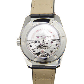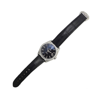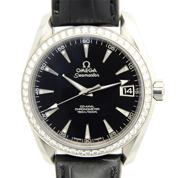 Silver-tone stainless steel case with a black leather strap. Fixed silver-tone diamond set bezel. Black dial with silver-tone arrow-shape hands and index hour markers. Minute markers around the outer rim. Dial Type: Analog. Luminescent hands and markers. Date display at the 3 o'clock position. Omega Calibre 8500 automatic movement with a 60-hour power reserve. Scratch resistant sapphire crystal. Screw down crown. Skeleton transparent exhibition see through case back. Round case shape, case size: 38.5 mm, case thickness: 14 mm. Band width: 22 mm, band length: 7 inches. Deployment with push button release clasp. Water resistant at 150 meters / 500 feet. Functions: date, hour, minute, second, chronometer. Luxury watch style. Watch label: Swiss Made. Item Variations: 231 18 39 21 51 001, 231-18-39-21-51-001, 231/18/39/21/51/001, 23118392151001. Omega Seamaster Aqua Terra Diamonds on Bezel Automatic Ladies Watch 231.18.39.21.51.001.
