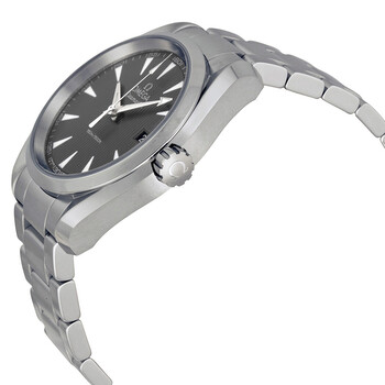 Stainless steel case with a stainless steel bracelet. Fixed stainless steel bezel. Dark grey dial with luminous silver-tone hands and stick hour markers. Minute markers around the outer rim. Dial Type: Analog. Luminescent hands and markers. Date display at the 3 o'clock position. Quartz movement. Scratch resistant sapphire crystal. Screw down crown. Solid case back. Case diameter: 38.5 mm. Round case shape. Deployment clasp with a push button release. Water resistant at 150 meters / 500 feet. Functions: date, hour, minute, second. Luxury watch style. Watch label: Swiss Made. Omega Seamaster Aqua Terra Grey Dial Stainless Steel Men's Watch 231.10.39.60.06.001.
