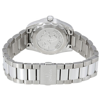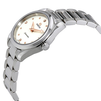 Stainless steel case with a stainless steel bracelet. Fixed stainless steel bezel. White dial with 18kt sedna gold hands and gold dot hour markers. Diamonds set at the 3, 6, 9 and 12 o'clock positions. Dial Type: Analog. Luminescent hands. Omega calibre 4061 quartz movement. Scratch resistant sapphire crystal. Screw down crown. Solid case back. Round case shape. Case size: 28 mm. Case thickness: 9 mm. Band width: 14 mm. Fold over clasp with a push button release. Water resistant at 150 meters / 500 feet. Functions: hour, minute. Luxury watch style. Watch label: Swiss Made. Omega Seamaster Aqua Terra Ladies Watch 220.10.28.60.54.001.