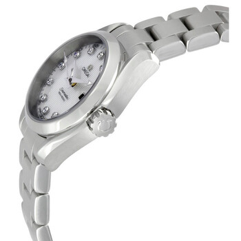 Stainless steel case with a stainless steel link bracelet. Fixed stainless steel bezel. Teck-silver dial with luminous hands and diamond hour markers. Minute markers around the outer rim. Date displays at the 3 o'clock position. Quartz movement. Scratch resistant double face anti-reflective sapphire crystal. Screw in crown. Solid case back. Case diameter: 30 mm. Case thickness: 11 mm. Deployment clasp. Water resistant at 150 meters (500 feet). Functions: hours, minutes, seconds, calendar. Omega Seamaster Aqua Terra Ladies Watch 231.10.30.61.55.001.