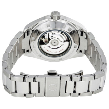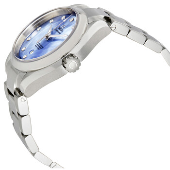 Stainless steel case with a stainless steel bracelet. Fixed stainless steel bezel. Lavender mother of pearl dial with luminous silver-tone hands and diamond hour markers. Dial Type: Analog. Luminescent hands. Date display at the 6 o'clock position. Omega calibre 8520 automatic movement, based upon Omega 8500, containing 28 Jewels, bitting at 25200 vph, and has a power reserve of approximately 50 hours. Scratch resistant sapphire crystal. Screw down crown. Transparent case back. Round case shape. case size: 34 mm. case thickness: 12.5 mm. Band width: 16 mm. Fold over clasp with a push button release. Water resistant at 150 meters / 500 feet. Functions: date, hour, minute, second. Seamaster Aqua Terra Series. Luxury watch style. Watch label: Swiss Made. Omega Seamaster Aqua Terra Lavender Mother of Pearl Dial Ladies Watch 231.10.34.20.57.002.