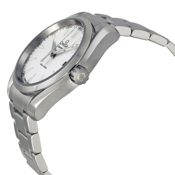 Stainless steel case with a stainless steel bracelet. Fixed stainless steel bezel. Silver guilloche dial with luminous silver-tone hands and index hour markers. Minute markers around the outer rim. Dial Type: Analog. Luminescent hands and markers. Date display at the 3 o'clock position. Quartz movement. Scratch resistant sapphire crystal. Screw down crown. Solid case back. Case diameter: 38.5 mm. Case thickness: 11 mm. Round case shape. Band width: 18 mm. Deployment clasp with push button release. Water resistant at 150 meters / 500 feet. Functions: date, hour, minute, second. Casual watch style. Watch label: Swiss Made. Omega Seamaster Aqua Terra Men's Watch 23110396002001.