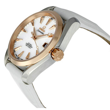 18kt rose gold and stainless steel case with a white leather strap. Fixed smooth 18kt rose gold bezel. Mother of pearl dial with rose gold-tone arrow-shaped hands and diamond index hour markers. Minute markers around the outer rim. Dial Type: Analog. Luminescent hands. Date display at the 3 o'clock position. Omega Calibre 8500 Automatic movement, containing 39 Jewels, composed of 202 parts, bitting at 25200 vph, and has a power reserve of approximately 60 hours. Scratch resistant sapphire crystal. Screw down crown. Transparent see through case back. Round case shape, case size: 38.5 mm. Deployment clasp. Water resistant at 150 meters / 500 feet. Functions: date, hour, minute, second, co-axial escapement, chronometer. Seamaster Series. Luxury watch style. Watch label: Swiss Made. Item Variations: 231 23 39 21 55 001, 231-23-39-21-55-001, 231/23/39/21/55/001, 23123392155001. Omega Seamaster Aqua Terra Midsize Chronometer Men's Watch 23123392155001.