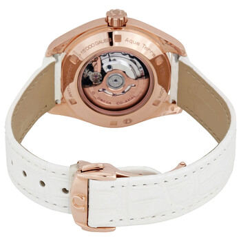 18kt rose gold case with a white leather strap. Fixed 18kt rose gold bezel. Mother of pearl dial with luminous rose gold-tone hands and diamond hour markers. Dial Type: Analog. Luminescent hands. Date display at the 6 o'clock position. Omega calibre 8521 automatic movement with a 50-hour power reserve. Scratch resistant sapphire crystal. Screw down crown. Transparent case back. Case size: 34 mm. Round case shape. Band width: 16 mm. Fold over clasp with a push button release. Water resistant at 150 meters / 500 feet. Functions: date, hour, minute, second. Luxury watch style. Watch label: Swiss Made. Omega Seamaster Aqua Terra Mother of Pearl Dial Ladies Watch 231.53.34.20.55.001.